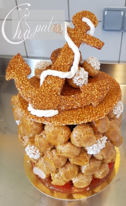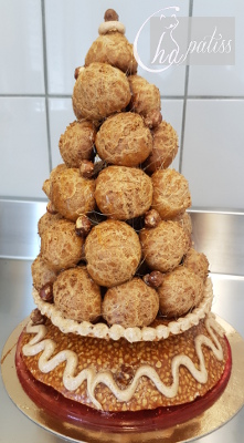 Les choux sont cuits le matin même, pour vous garantir une grande fraicheur. Les pièces montées sont extrèmement sensibles à l'humidité et à la chaleur notamment, nous avons donc choisi de les réaliser le plus tard possible afin de limiter les risques d'un caramel qui colle aux dents ou même d'effondrement de la pièce montée.